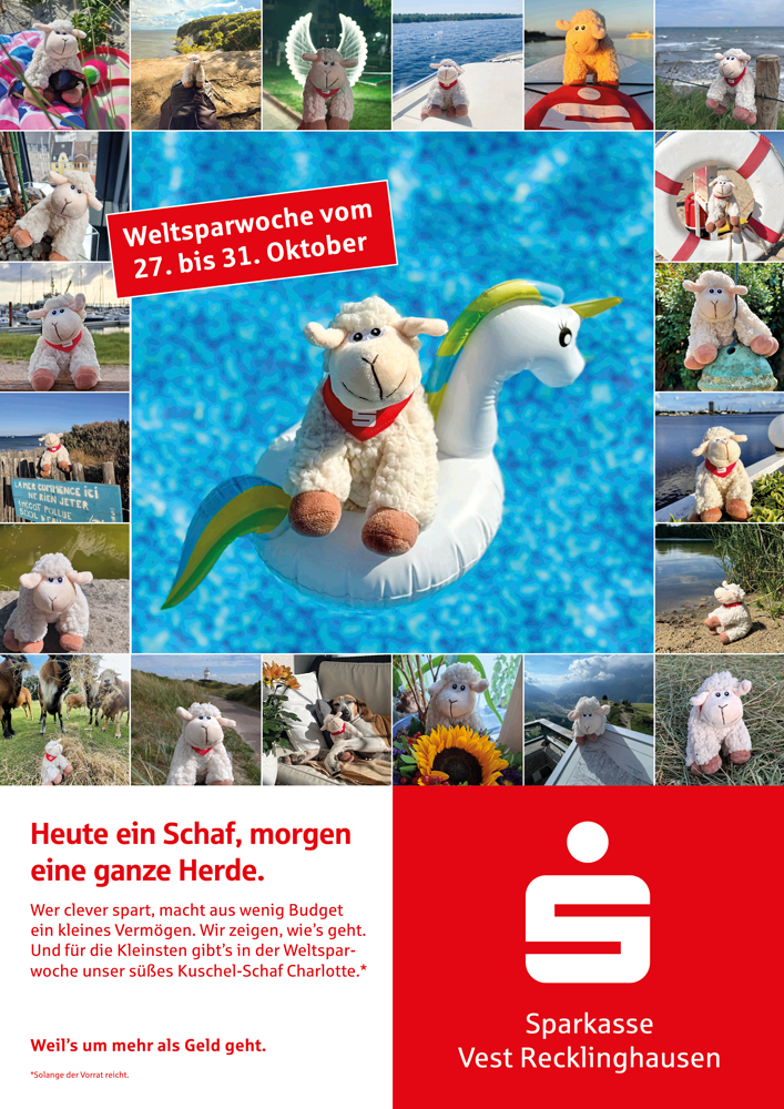 Zum Weltspartag 2025 setzte unser langjähriger Kunde Sparkasse Vest Recklinghausen auf einen echten Sympathieträger: das Plüschmaskottchen „Kuschel-Schaf Charlotte“.